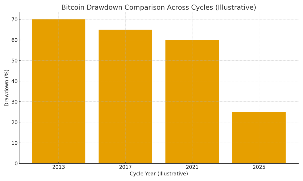 Bernstein highlights that previous crypto cycles saw 60–70% corrections, whereas today’s 25% pullback is significantly milder.