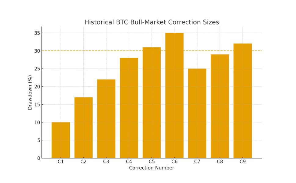 - Bitcoin’s recent ~30% decline is fully consistent with historical bull-market corrections, not the beginning of a long-term bear market.