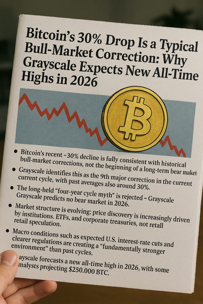 Bitcoin’s sharp decline from its early-October all-time high near $125,000 to the late-November low of $84,000 startled many investors. The magnitude of the move—roughly 32%, or a drop of over $41,000 in USD terms—invited fears that the bull market had ended. Yet Grayscale Investments, the world’s largest crypto asset manager, has released a report arguing precisely the opposite. According to Grayscale, this price movement is not only typical but also healthy within a long-term upward trend.