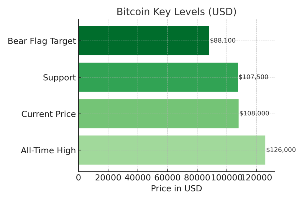 • The measured target from the flag’s size comes to around $88,100, representing approximately a 19 % drop from current levels (~$108,000).