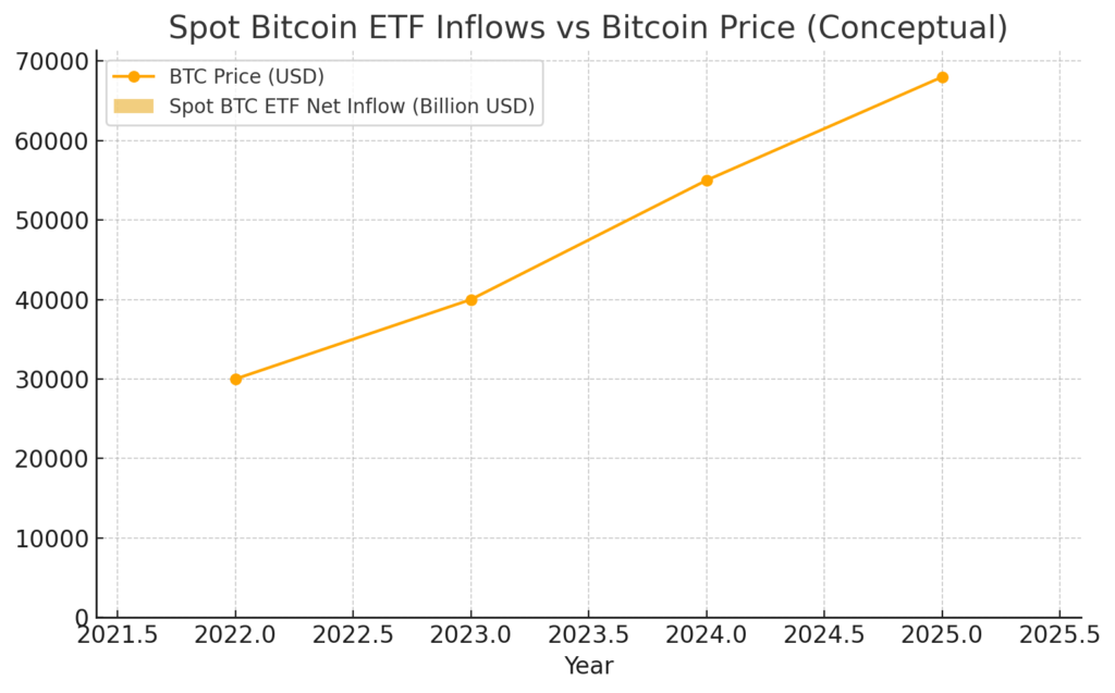 Another significant development is the rise of physical spot Bitcoin ETFs (e.g., in the U.S.). These vehicles have introduced a transparent channel for institutional capital to flow into BTC markets, and thereby the macro-signals above now feed directly into crypto demand. One study observes the introduction of U.S. spot Bitcoin ETFs reduced volatility of older vehicles and changed return dynamics.
