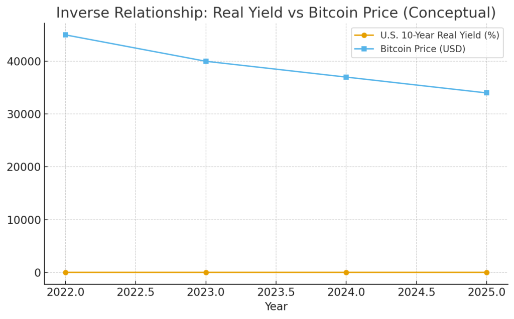 • Real yields (interest rates minus inflation expectations) represent the opportunity cost of holding non-yielding assets like Bitcoin. When real yields are high, cash and short-term Treasuries compete with Bitcoin for capital; when real yields fall, holding Bitcoin becomes relatively more attractive.
