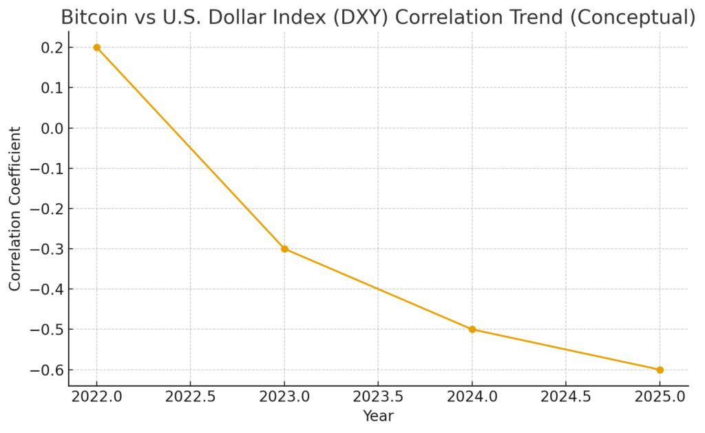 • Bitcoin’s price movements are increasingly tied to the U.S. dollar index (DXY) and real interest rates, rather than simply inflation.
