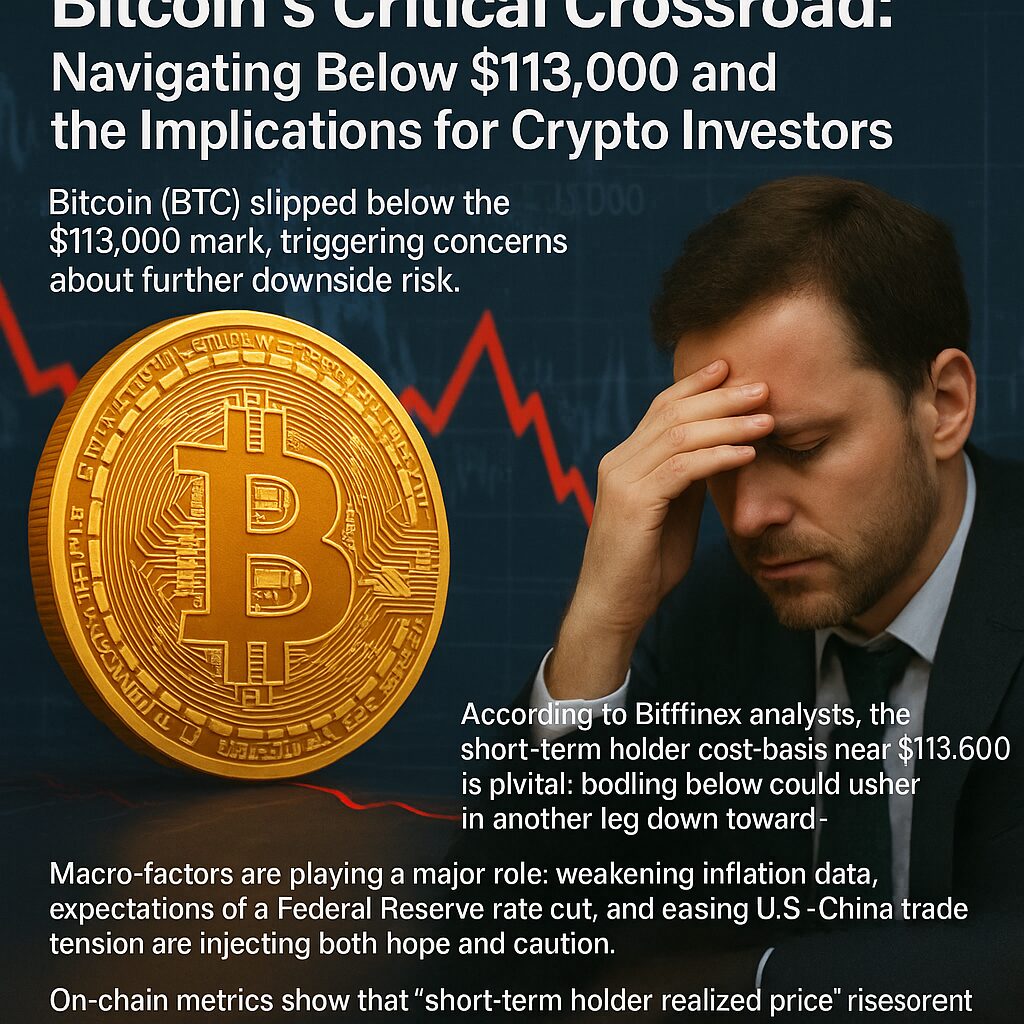 The current moment for the cryptocurrency market is a crossroads. The flagship asset, Bitcoin, is flirting with a critical zone around ~$113,000—indeed, this level is tied into short-term holder cost bases, on-chain metrics and broader sentiment. How it behaves now could determine whether we see a renewed accumulation phase (and thus a favourable environment for altcoins and blockchain infrastructure) or a deeper corrective phase (ushering in caution).