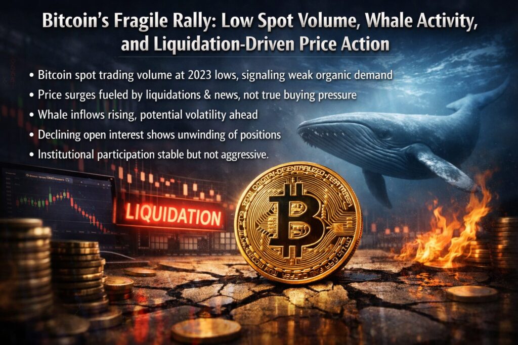 Bitcoin’s recent rally above $71,700 may appear bullish at first glance, but a deeper analysis reveals a market driven more by technical factors than genuine demand. Declining spot volume, weak exchange flows, and negative institutional premiums all point to a lack of strong participation.