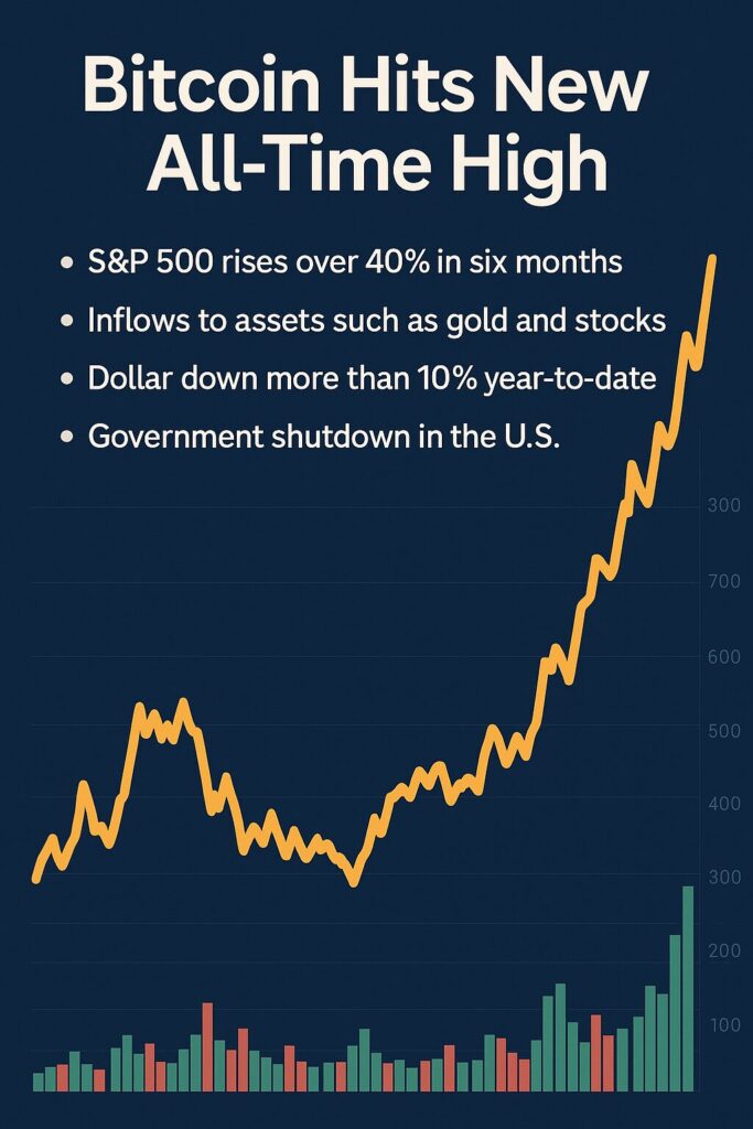 - On October 6, 2025, Bitcoin set a fresh all-time high near $125,653 as markets sought alternative assets amid fears around U.S. government shutdown and dollar weakness.