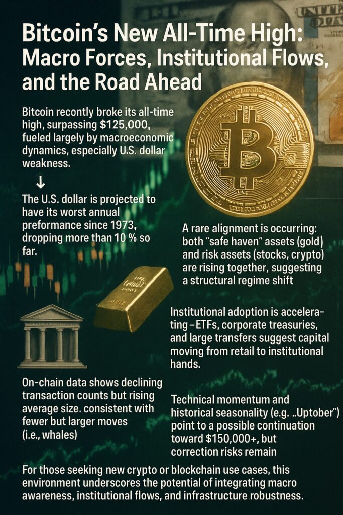 Bitcoin’s ascent past $125,000 is more than a speculative milestone—it may mark a turning point in how markets view digital assets. Driven by dollar debasement, macro liquidity, political fragility, and institutional flows, Bitcoin is increasingly behaving like a macro asset rather than an isolated token.