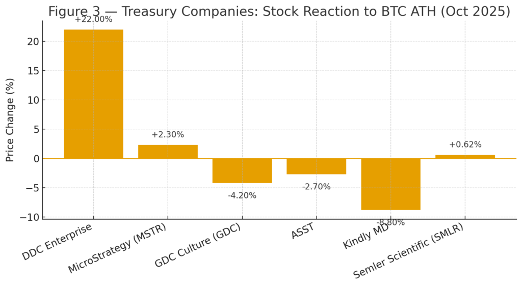 - However, corporate treasuries that hold Bitcoin showed mixed performance: some (e.g. DDC Enterprise) surged, while others (e.g. Strategy / formerly MicroStrategy) lagged.