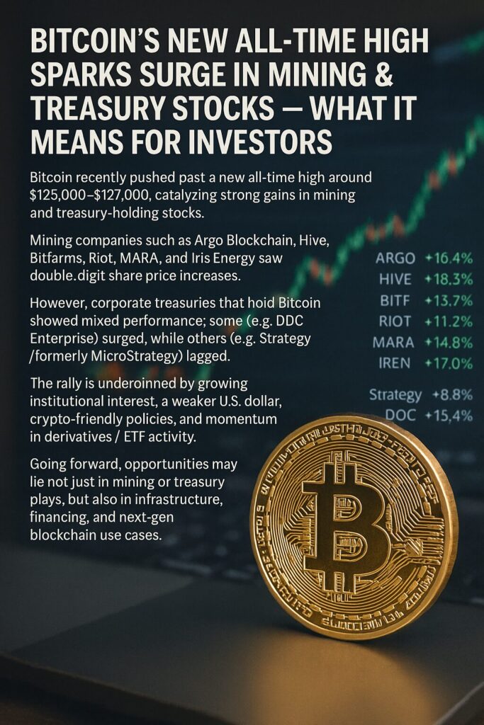 - Bitcoin recently pushed past a new all-time high around $125,000–$127,000, catalyzing strong gains in mining and treasury-holding stocks.