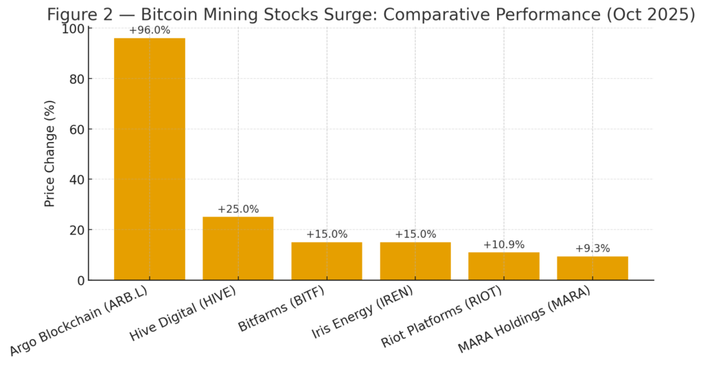 - Argo Blockchain (London-listed) led global miners with a gain of 96%, rising to 5.3 pence (≈ $0.07) intraday.