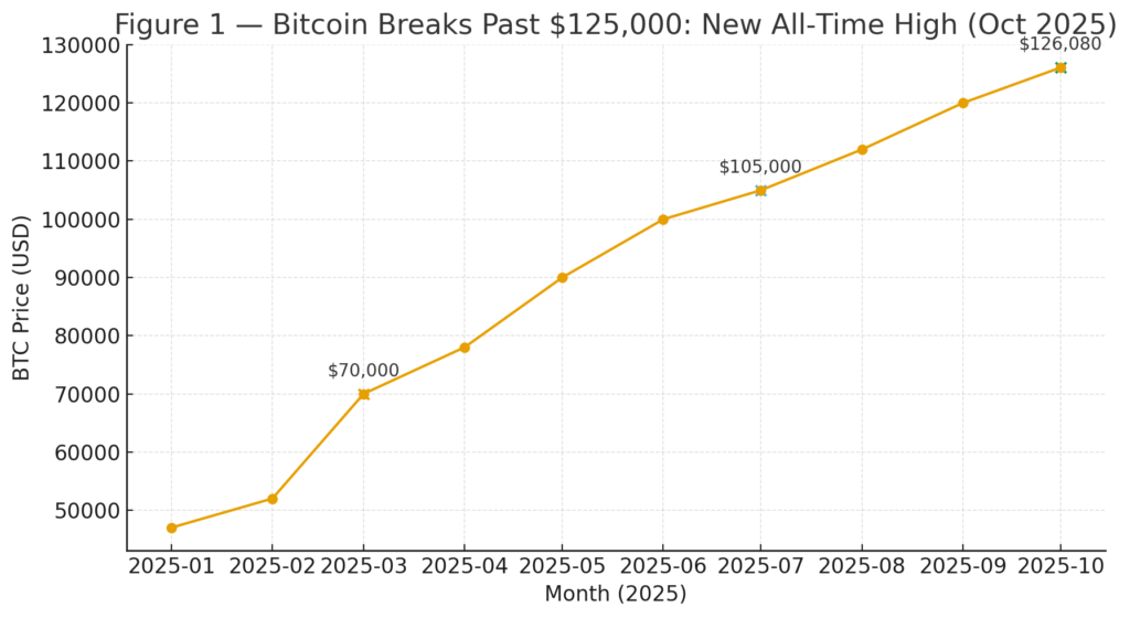 In early October 2025, Bitcoin surged past $125,000, later climbing even toward $127,000 in intra-day trading. This breakout above prior resistance levels lit a spark across crypto markets, with volume, implied volatility, and derivatives open interest all rising sharply. Analysts point to several underlying drivers: