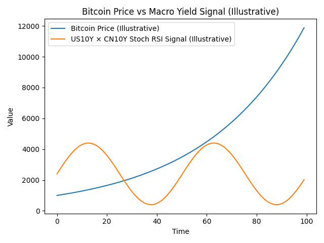 The model combines the 10-year U.S. Treasury yield (US10Y) and the 10-year Chinese government bond yield (CN10Y) and then applies a Stochastic RSI indicator to the product of those yields. According to analysts who have studied the pattern, bullish signals generated by this indicator have historically coincided with major Bitcoin market bottoms.