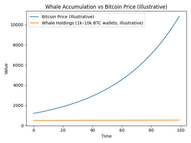 Chart showing Bitcoin price vs whale wallet holdings (1k–10k BTC) highlighting accumulation phases before major bull markets.