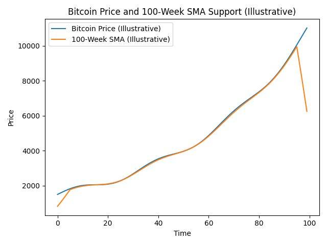 Weekly Bitcoin chart showing the 100-week SMA support line, RSI oversold levels, and historical rebounds.