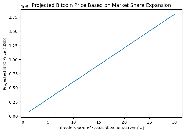 Bitcoin Price = (Total Store-of-Value Market × Bitcoin Market Share) ÷ Total BTC Supply
