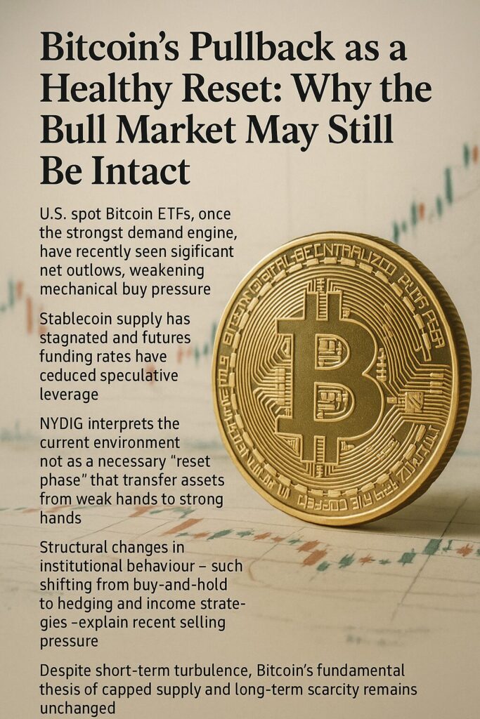 ETF net outflows have intensified, futures funding rates have fallen, and the once-dominant inflow engine has notably weakened. At first glance, these developments could be interpreted as signs of a deteriorating bull market. However, NYDIG argues that the opposite is true: what the market is experiencing is not a breakdown, but a reset, clearing excess froth before the next expansionary phase.