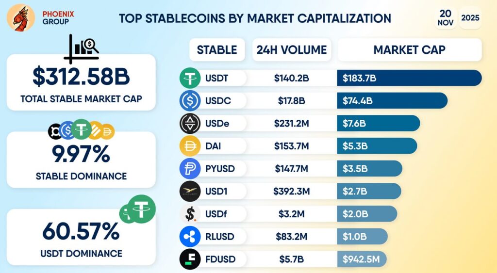 Stablecoins serve as the “liquidity rails” of the crypto market. When stablecoin supply expands, new purchasing power typically flows into risk assets like Bitcoin. Conversely, stagnation or contraction reflects liquidity tightening.