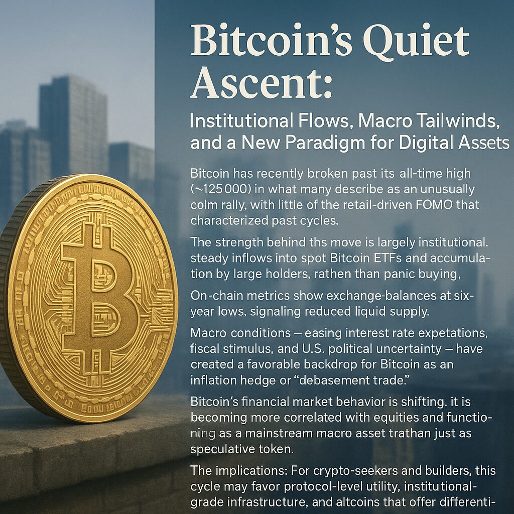 “Bitcoin’s Quiet Ascent: Institutional Flows, Macro Tailwinds, and a New Paradigm for Digital Assets”
