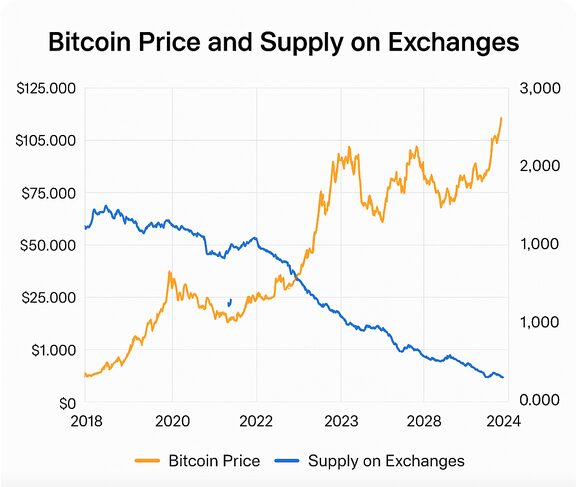 • On-chain metrics show exchange balances at six-year lows, signaling reduced liquid supply.