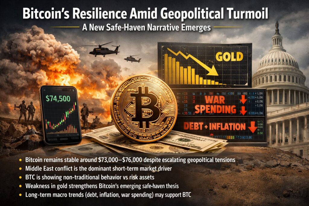 Bitcoin has demonstrated notable resilience this week, trading within a relatively tight range between approximately $72,000 and $76,000, despite escalating geopolitical tensions in the Middle East.