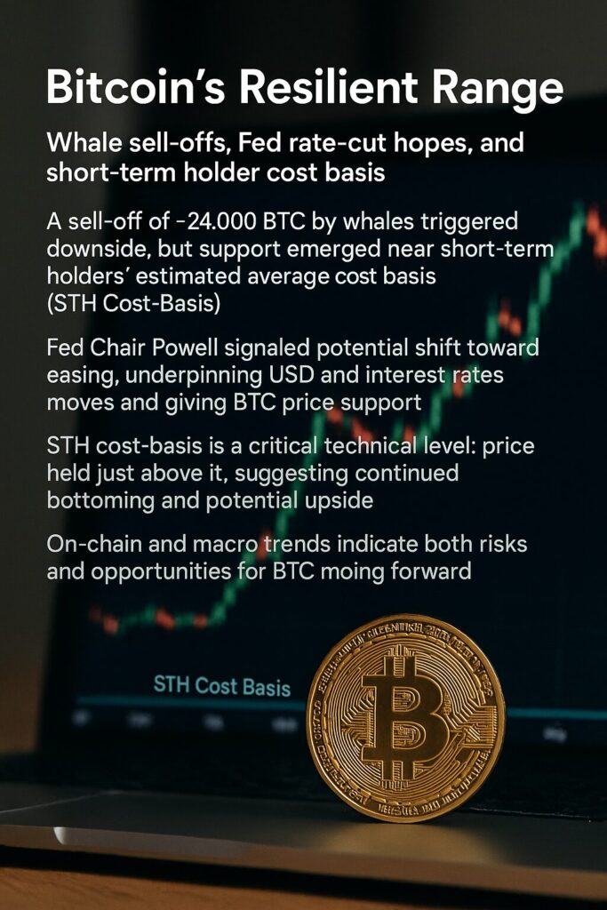 - A sell‑off of ~24,000 BTC by whales triggered downside, but support emerged near short‑term holders’ estimated average cost basis (STH Cost‑Basis).