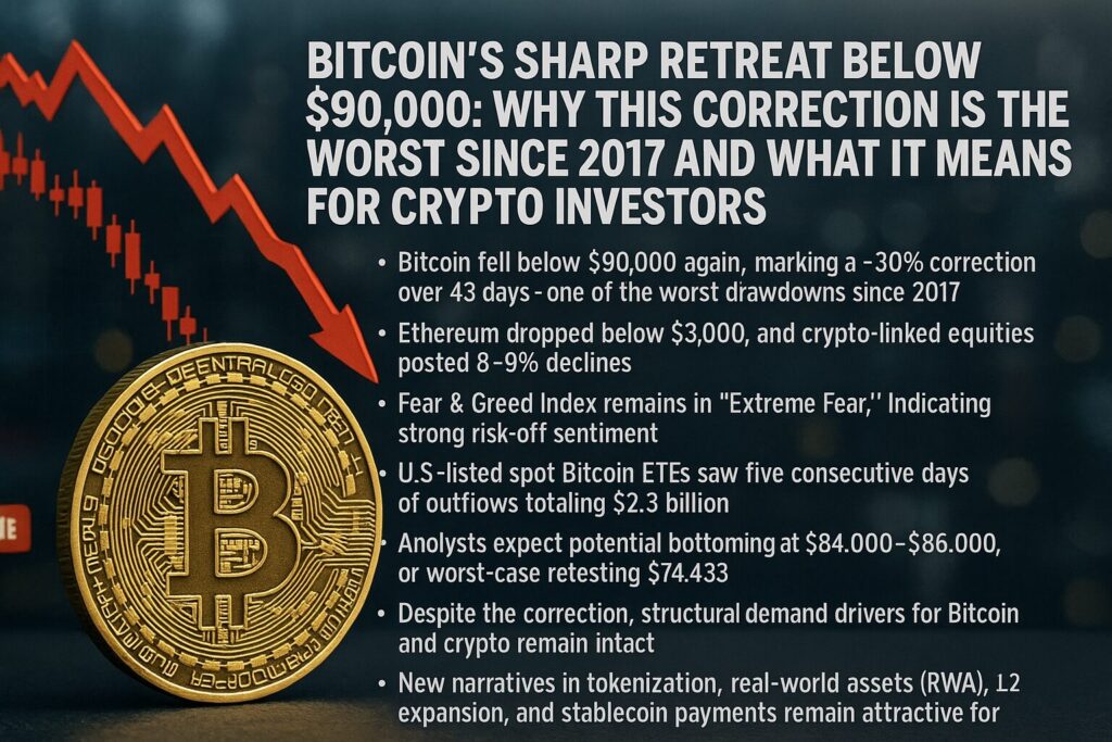 - Bitcoin fell below $90,000 again, marking a ~30% correction over 43 days—one of the worst drawdowns since 2017.