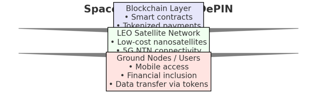 - The technology stack integrates 5G NTN standards, blockchain payment/staking models, and open-source hardware design to enable both connectivity users and node operators.