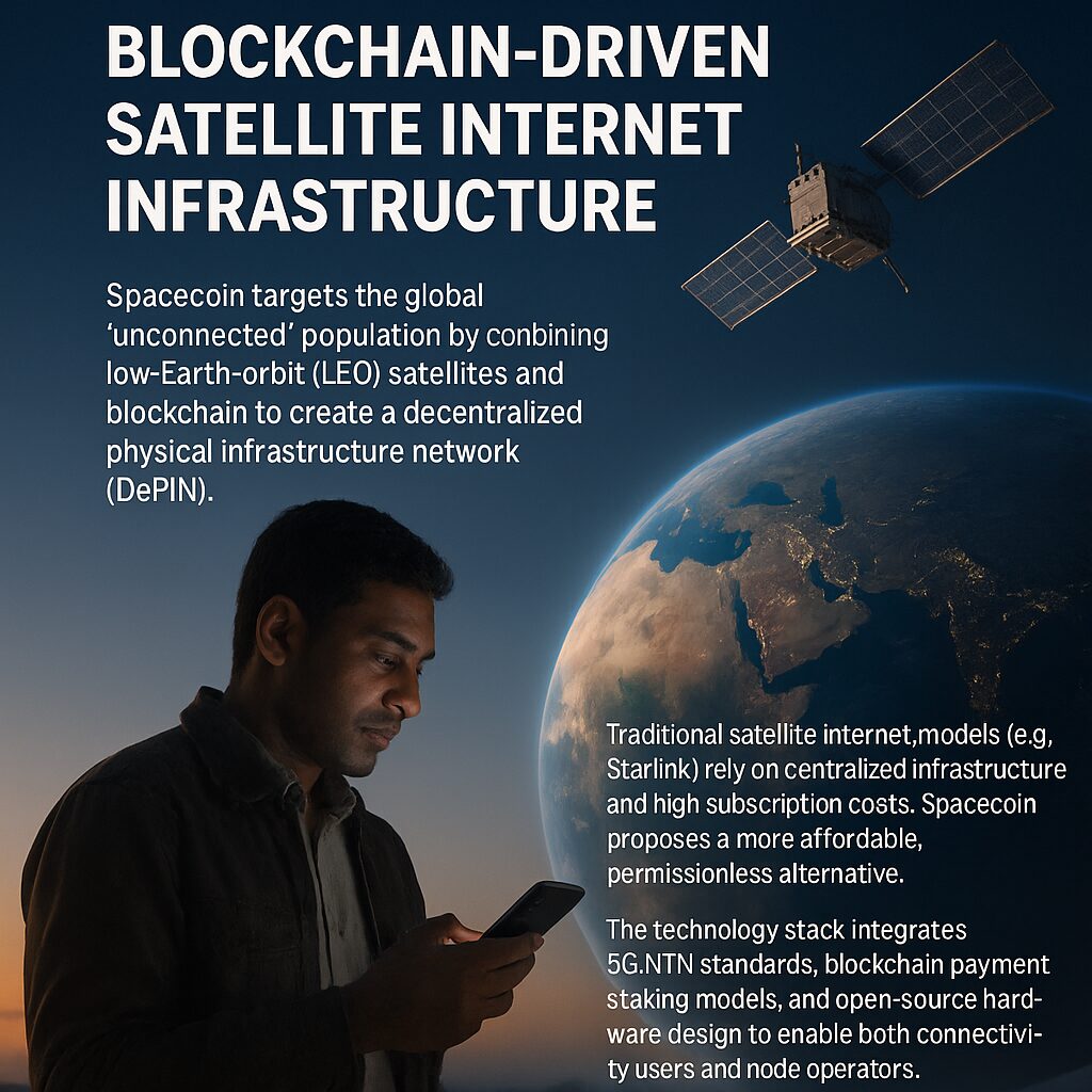 - Spacecoin targets the global “unconnected” population by combining low-Earth-orbit (LEO) satellites and blockchain to create a decentralized physical infrastructure network (DePIN).