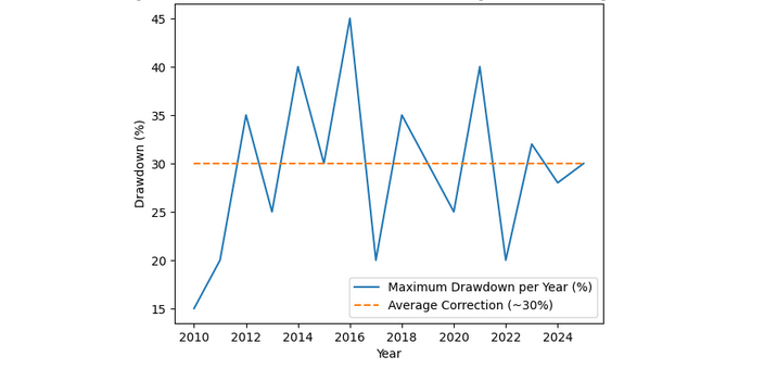 [Historical Bitcoin drawdowns and average correction magnitude]