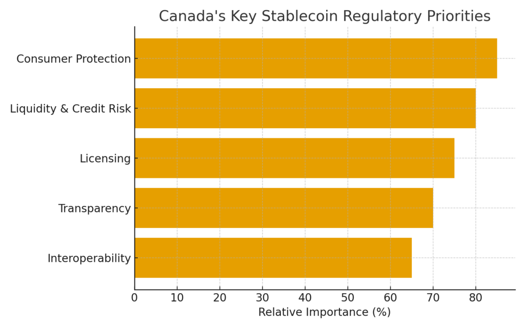 - Cross-border coordination means global stablecoin players (e.g., those issuing USD-backed tokens) may dominate unless Canadian-domestic value propositions and competitiveness are enhanced.