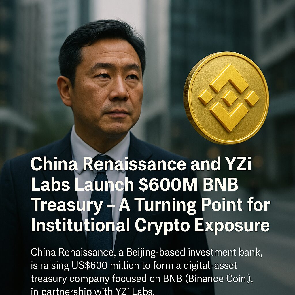 - China Renaissance, a Beijing-based investment bank, is raising US$600 million to form a digital-asset treasury company focused on BNB (Binance Coin), in partnership with YZi Labs.