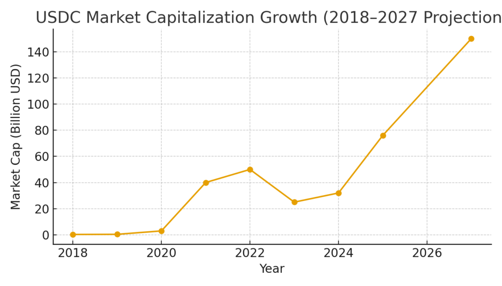 - USDC’s market capitalization could double by 2027, reaching ~$150 billion.