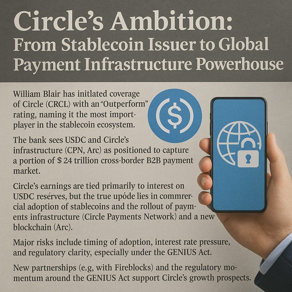 In October 2025, investment bank William Blair initiated coverage on Circle (CRCL), assigning it an “Outperform” rating and labeling it the single most important enterprise in the stablecoin ecosystem. Blair’s thesis positions Circle—and in particular USDC, the company’s flagship stablecoin—as a pivot in the shift from fiat-driven payments toward blockchain-native settlement in global commerce. This article will summarize Blair’s reasoning, combine it with recent developments, and offer an outlook for those seeking new crypto opportunities or blockchain-based real-world use cases.
