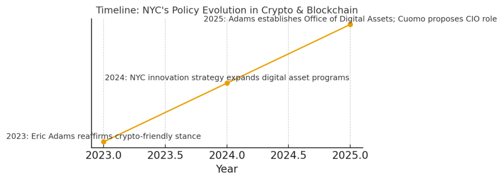 - The incumbent mayor Eric Adams has already established the U.S.’s first municipal “Office of Digital Assets and Blockchain Technology” via Executive Order 57, signalling NYC’s ambition to become a global digital-asset hub.