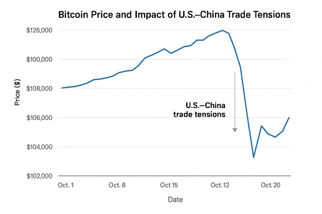 - Renewed U.S.–China trade tensions triggered a sharp and rapid drop in Bitcoin (BTC), echoing earlier spring-2025 volatility.