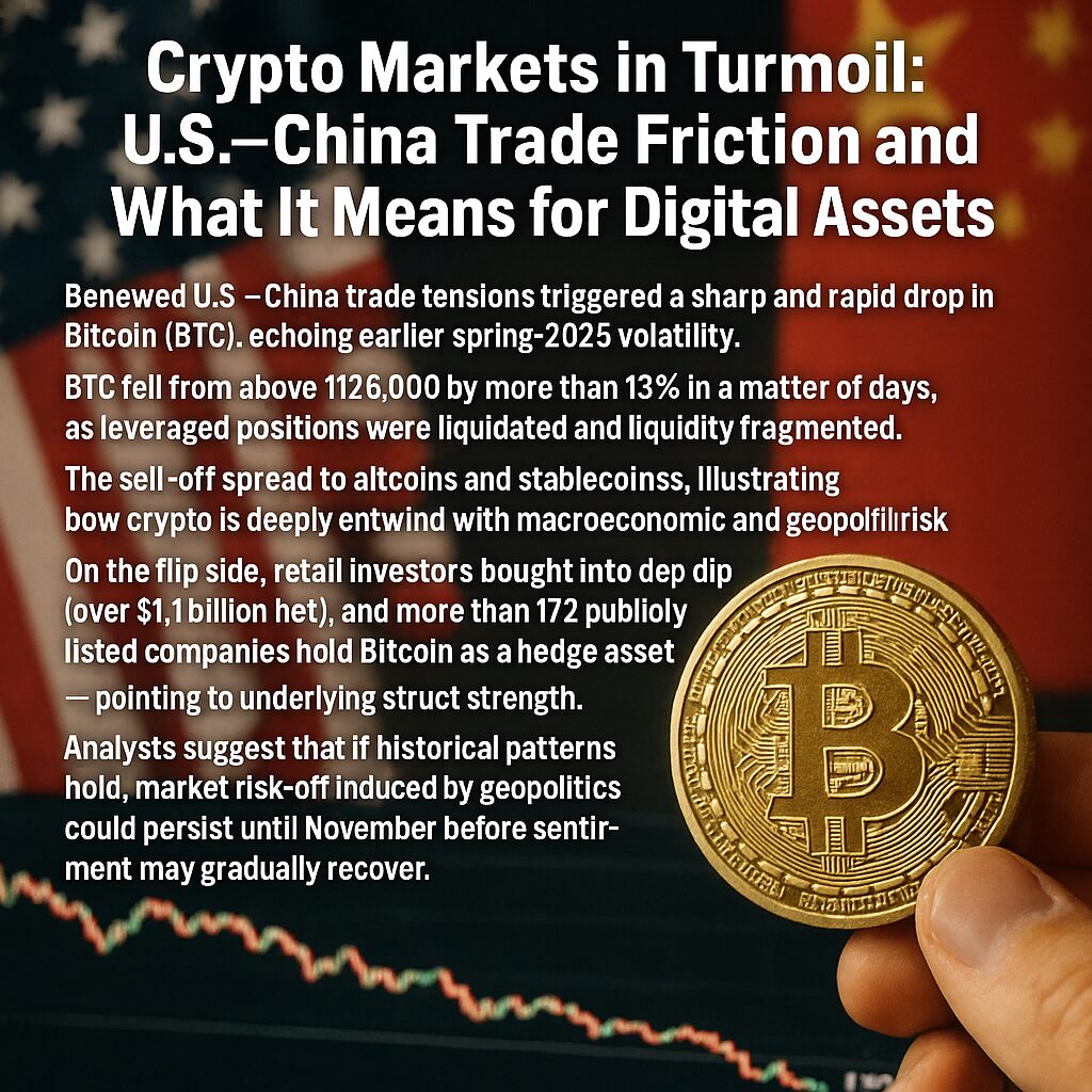The imminent drop in Bitcoin and the wider crypto market triggered by U.S.–China trade spill-over has re-emphasised a key lesson: digital assets do not exist in a vacuum. For those seeking new opportunities in crypto or blockchain utility, the interplay of macro forces, geopolitics and protocol fundamentals is now inseparable from asset selection.
