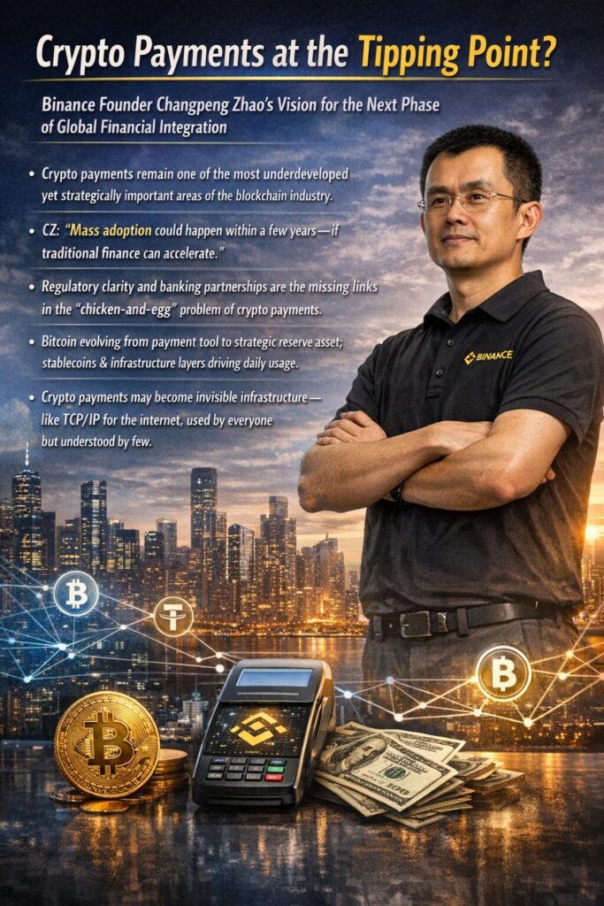 CZ’s central claim is bold: crypto payments could see meaningful global adoption within a few years, provided the right integration pathways emerge between blockchain systems and traditional finance.