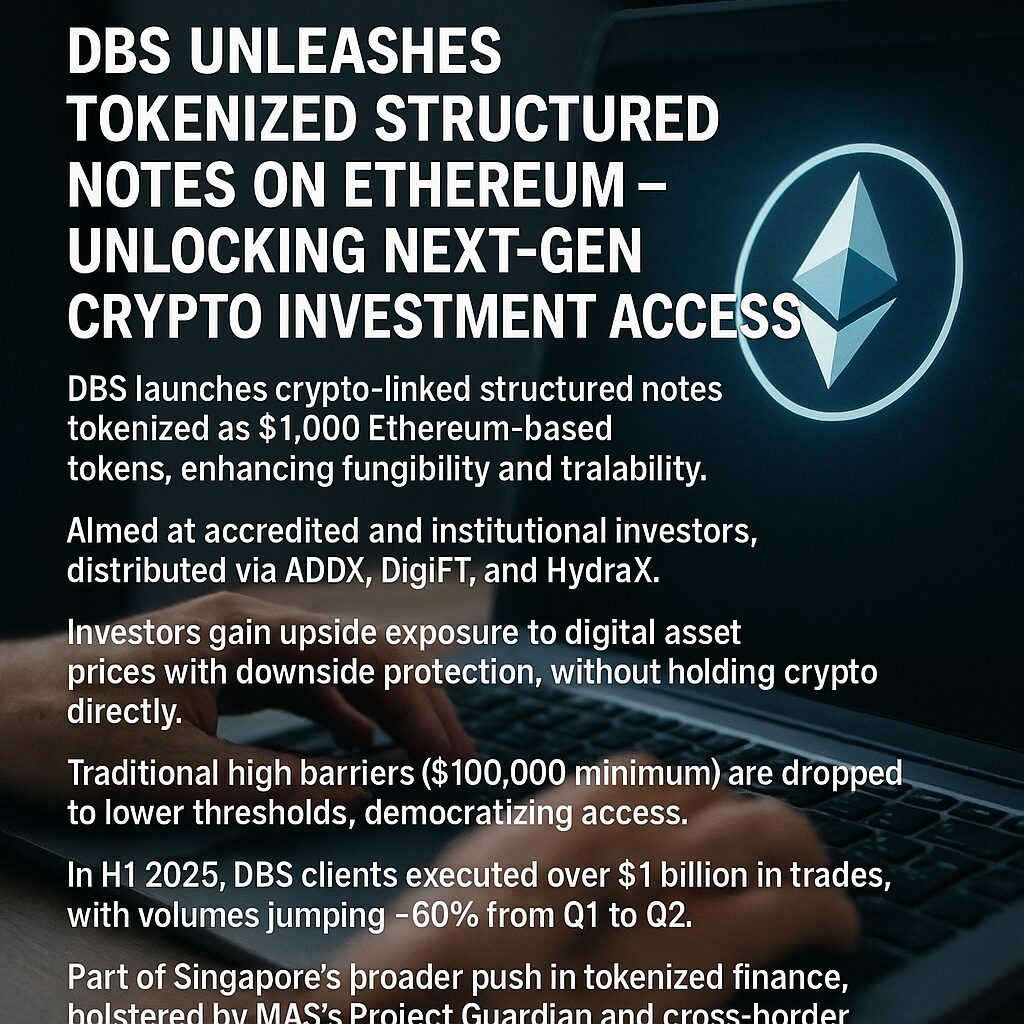 - DBS launches crypto-linked structured notes tokenized as $1,000 Ethereum‑based tokens, enhancing fungibility and tradability.