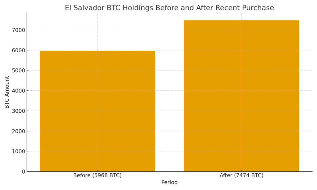 - The country added 1,090 BTC, increasing national reserves from 5,968 BTC to over 7,474 BTC.