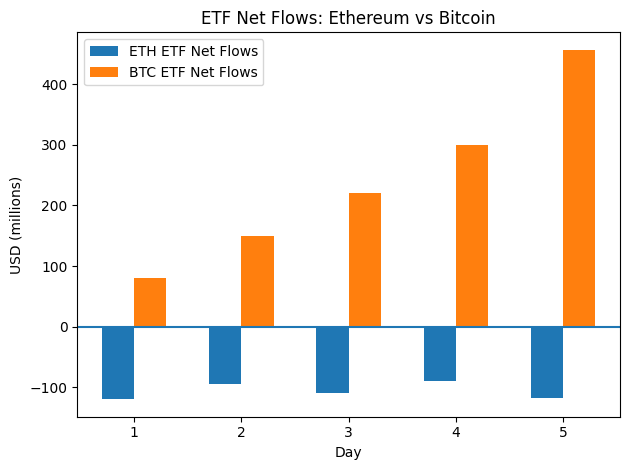 A bar chart showing cumulative ETF outflows for ETH versus inflows for BTC.