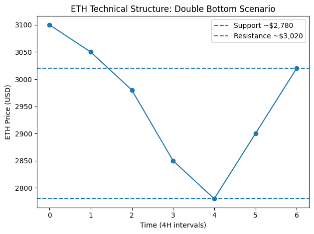 On the 4-hour chart, ETH appears to be forming a potential double bottom near $2,780, aligned with the lower Bollinger Band at approximately $2,779.63. Historically, this zone has served as a reversal point during oversold conditions.
