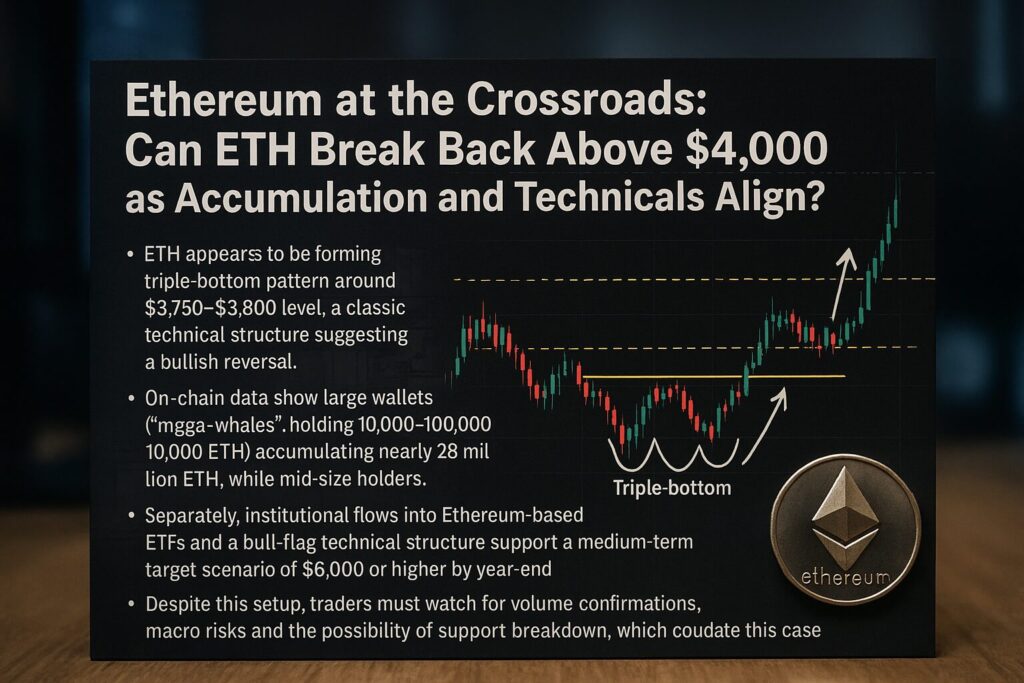 - Ethereum (ETH) appears to be forming a triple-bottom pattern around the $3,750–$3,800 level, a classic technical structure suggesting a bullish reversal.