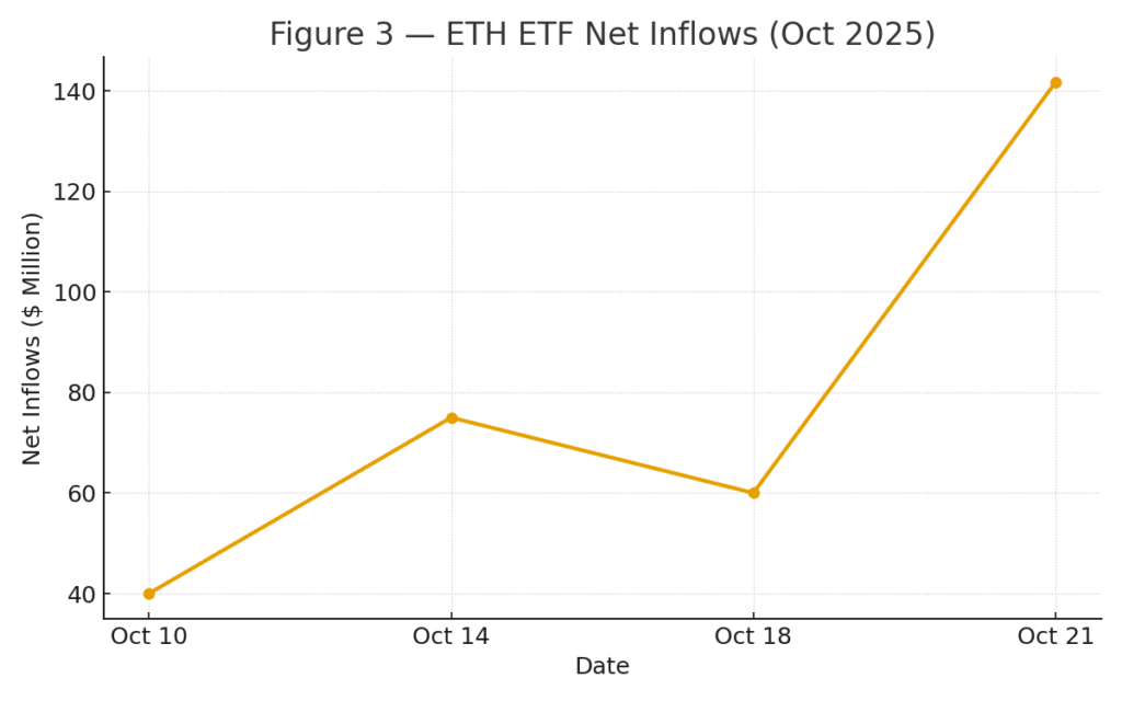 Beyond the short-term chart pattern, another important trend is the growing institutional interest in Ethereum. Recent reports show that Ethereum-based ETFs (for example in the U.S.) recorded net inflows of $141.7 million on a single day (October 21, 2025) showing renewed momentum from institutional capital.