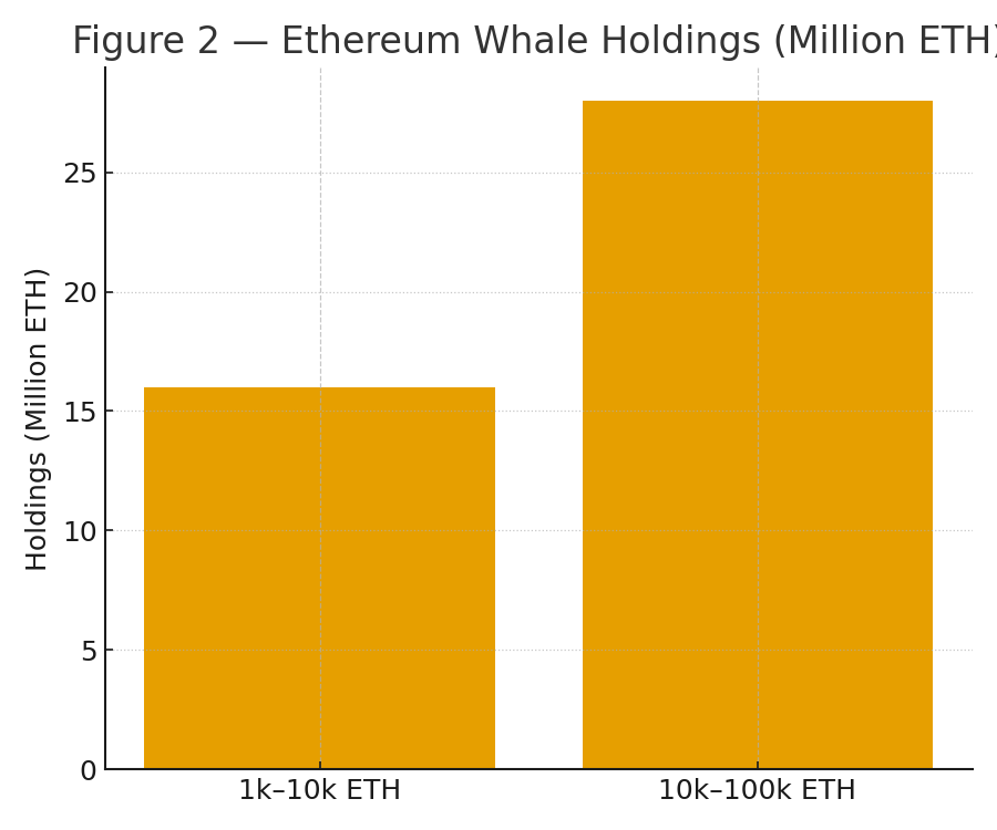 - On-chain data show large wallets (“mega-whales”, holding 10,000–100,000 ETH) accumulating rapidly, now controlling nearly 28 million ETH, while mid-size holders (1,000–10,000 ETH) are reducing balances.