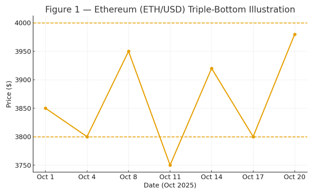In October, Ethereum has been under pressure, down around 6.5 % as price dipped toward the $3,750-$3,800 region. According to technical charting, the 4-hour timeframe appears to show a triple-bottom formation — the price tested the same support zone three times and failed to break lower.