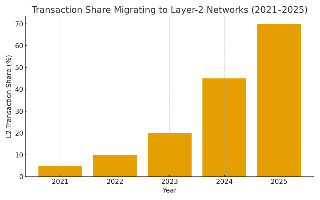 As a result, Layer 2 networks—such as roll-ups—have seen surging adoption. One source cites “1.6 million daily transactions via L2 scalability” and 46 million monthly transactions.