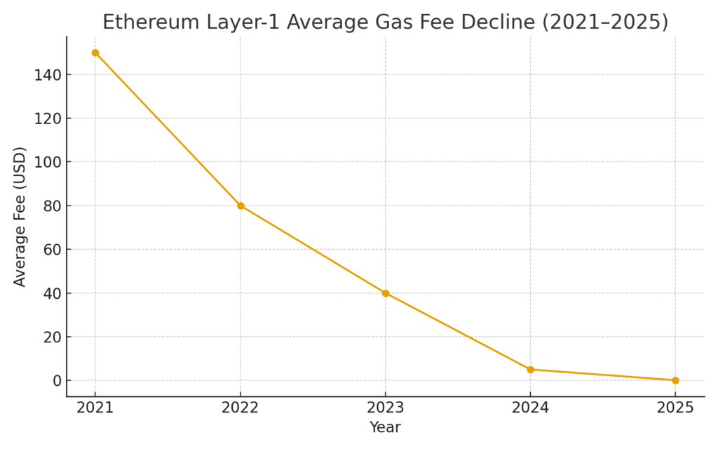 This dramatic reduction is largely driven by decreased L1 load and the scaling of rollups and L2 solutions, which free up L1 capacity and drive down fees.