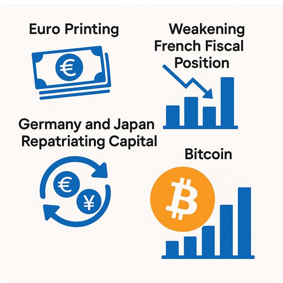 - Arthur Hayes argues that France’s escalating fiscal deficit may force the European Central Bank (ECB) to resume large-scale euro issuance (quantitative easing), potentially devaluing the euro and driving capital flows into Bitcoin and gold.