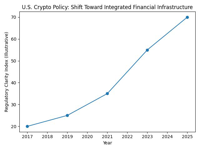 Below is an illustrative chart showing how U.S. crypto policy has gradually shifted from enforcement-heavy ambiguity toward regulatory integration.