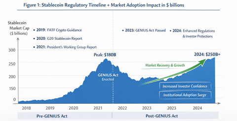 (Suggesting a timeline showing stablecoin regulatory milestones against market size growth, including pre‑ and post‑GENIUS Act effects.)